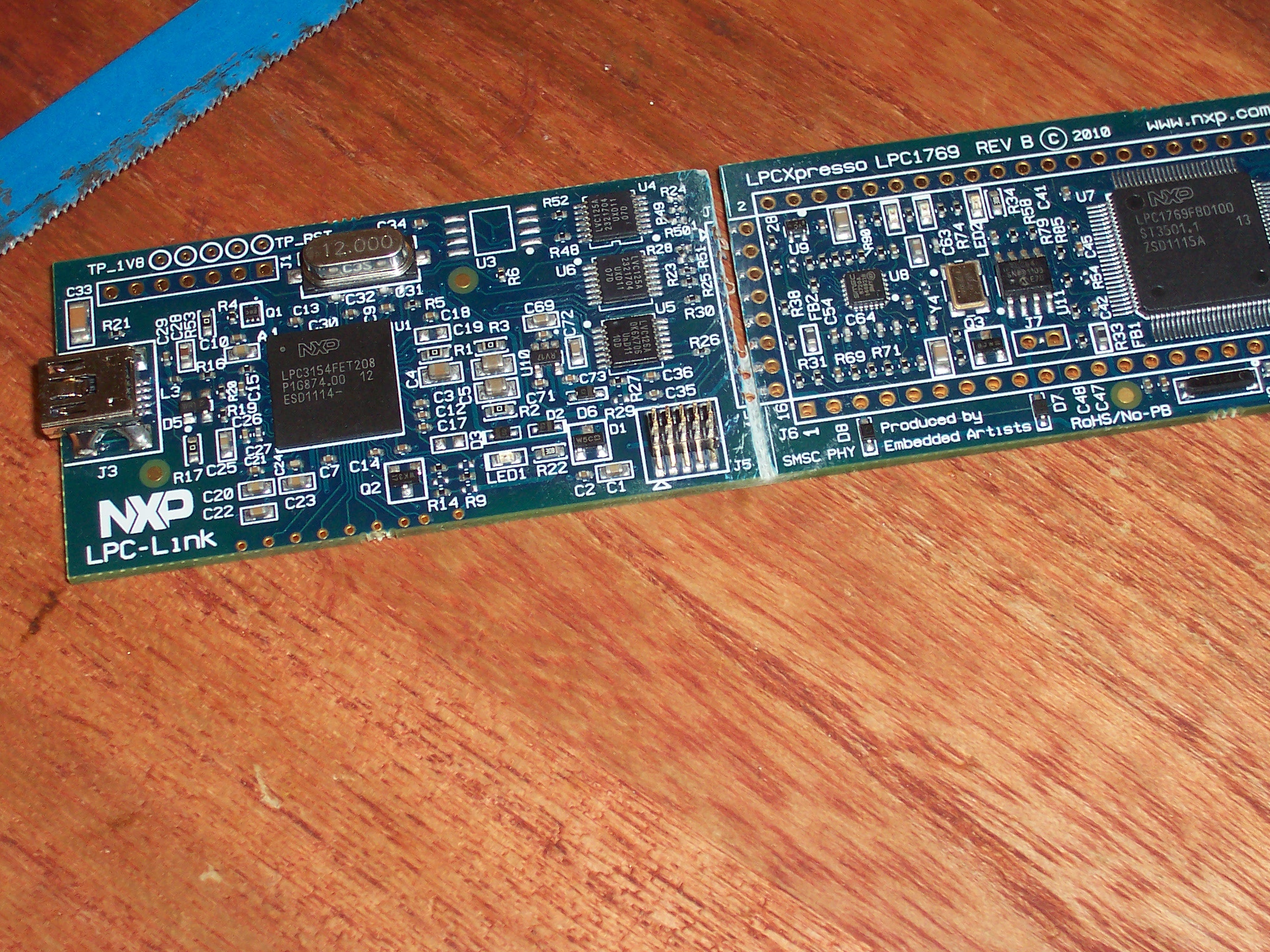 The board is made in two halves: the left half is the JTAG programmer, the right half is the board itself. The left half does not work with any Linux / Open-source tools; ie: it is worthless. We will cut it off with a hacksaw.